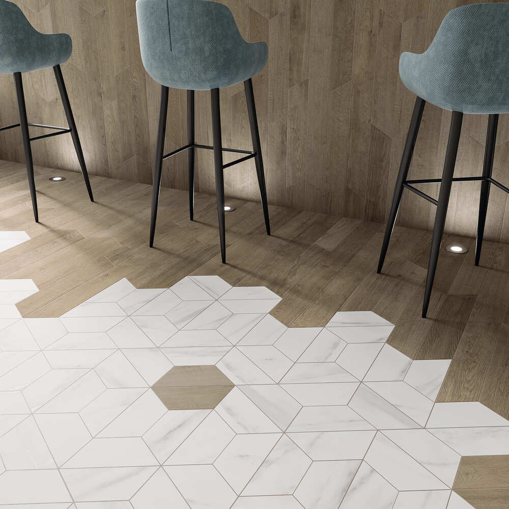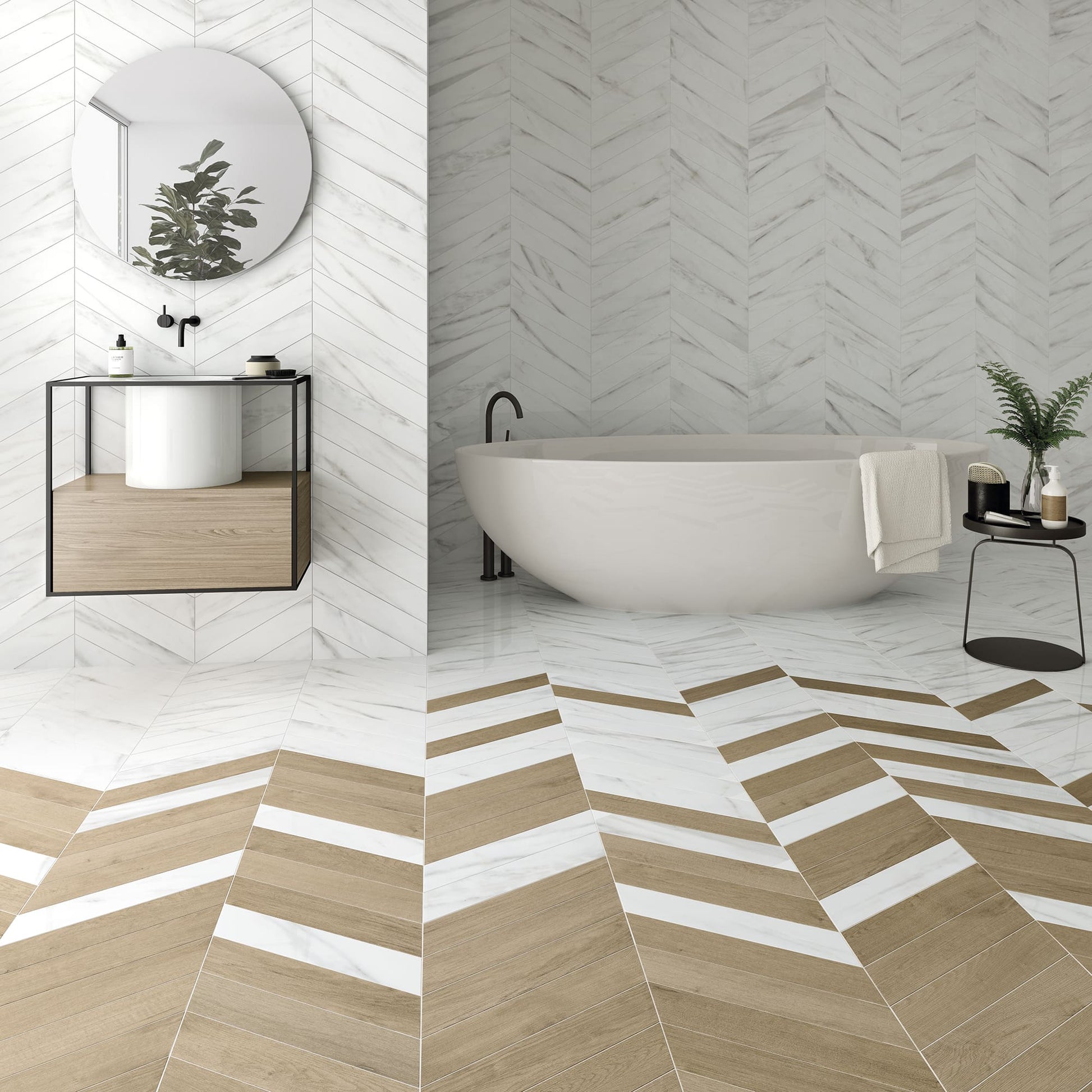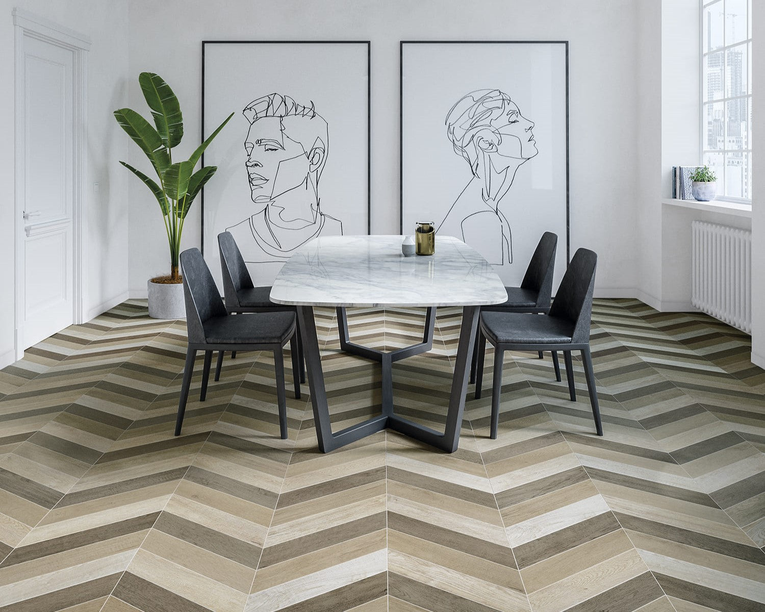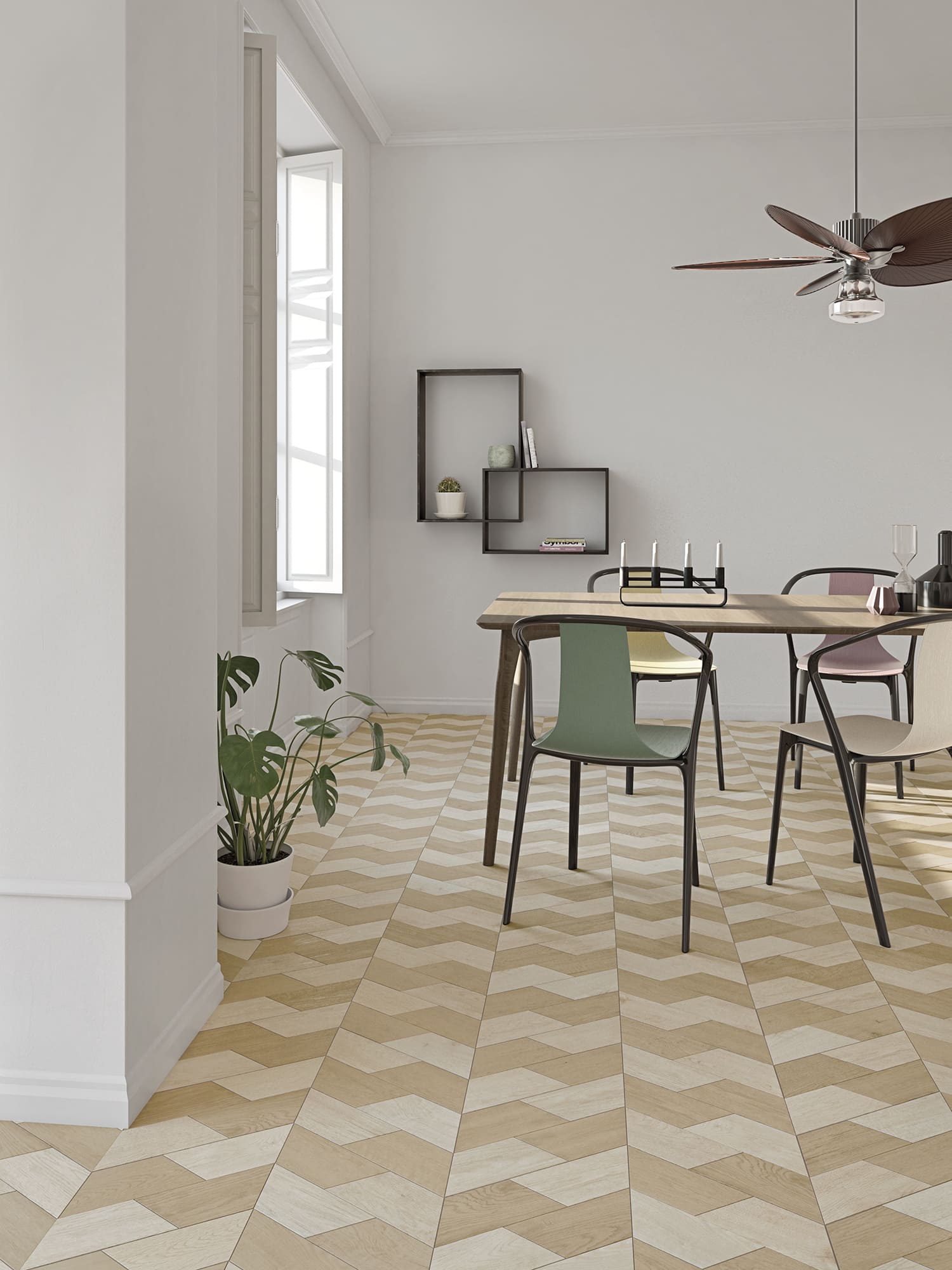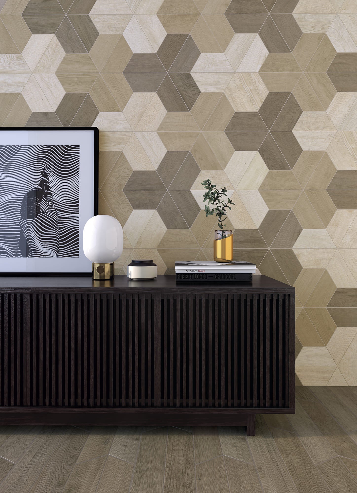 A fluid dialogue between the wood and the stone, that allows open plan stays with floors smoothly blended without room dividers. Chevron and Trapezoid are complementary shapes with a 60º angle in common to set up in combination or solo. Three natural wooden tones and a calacatta-inspired stone conforming the unusual elegance of 60 DEGREE.