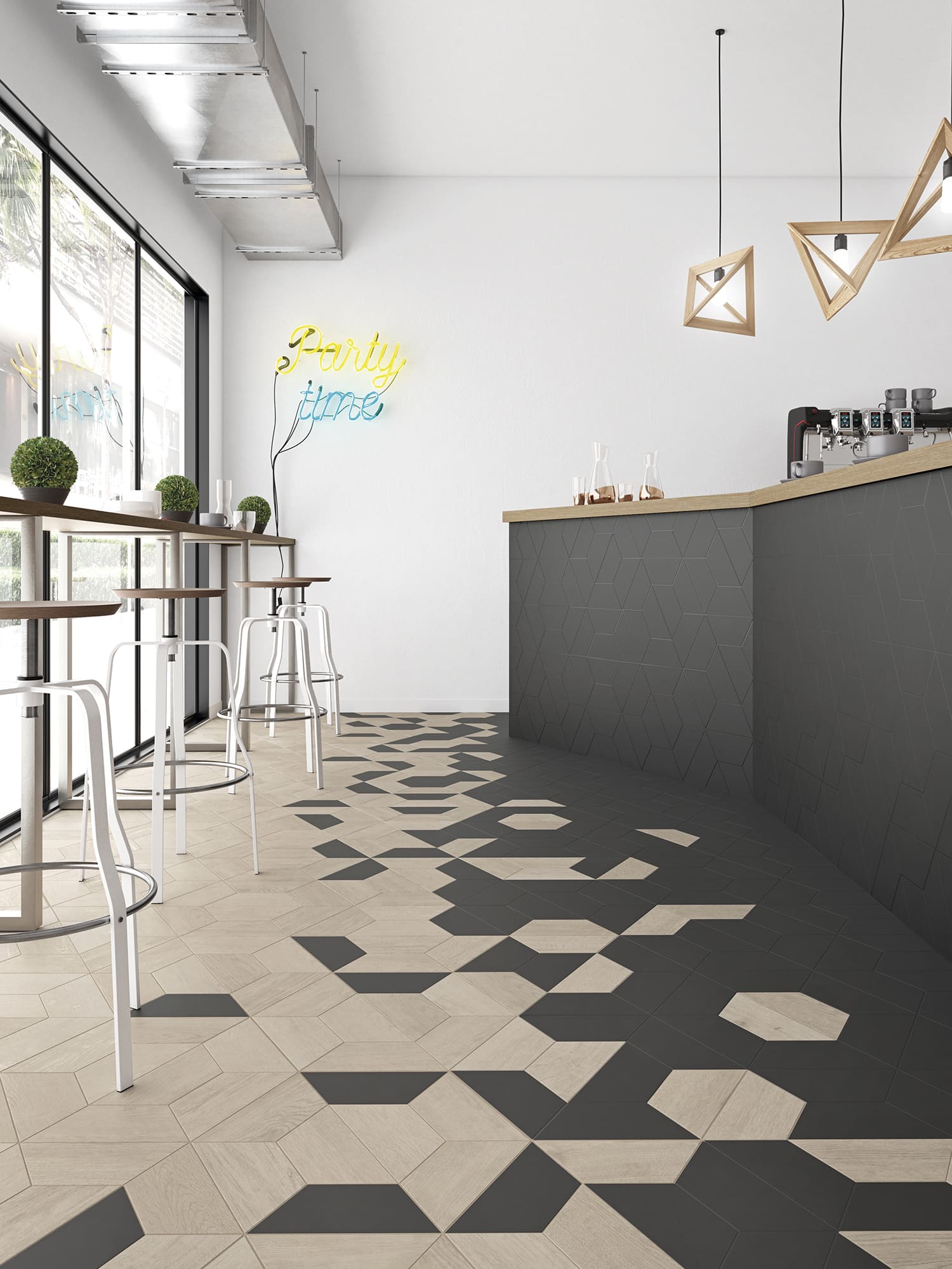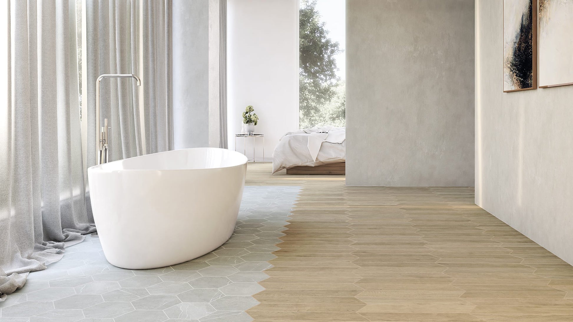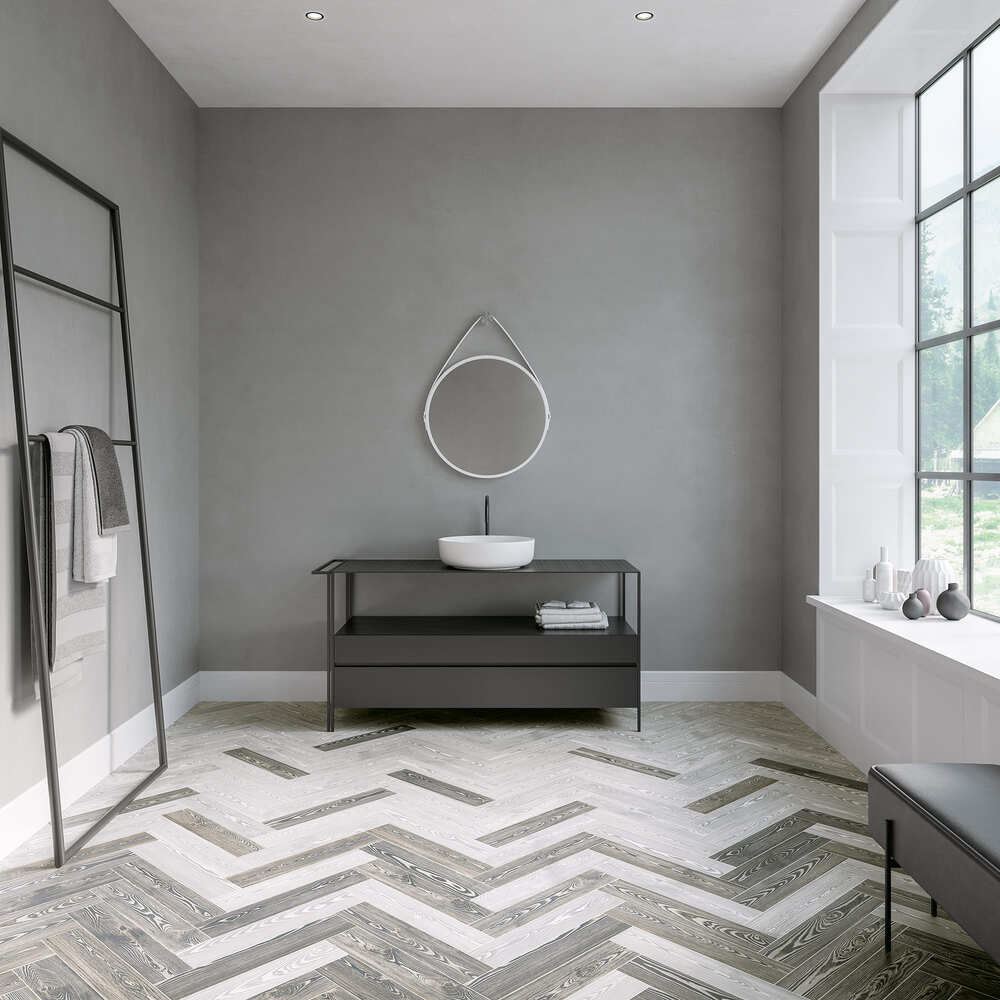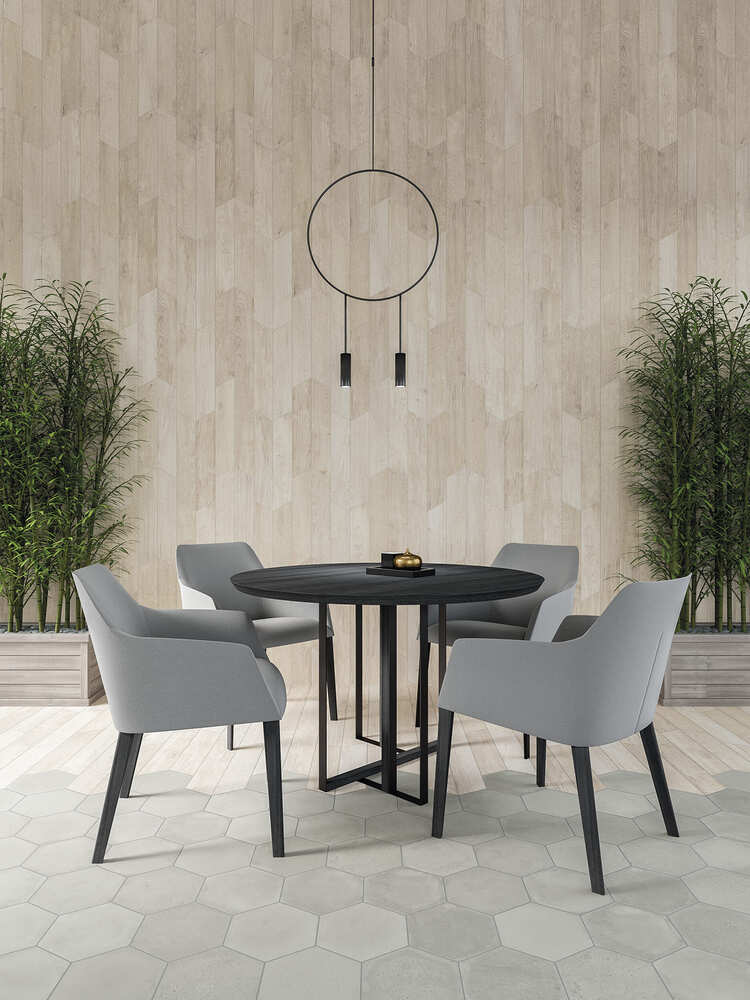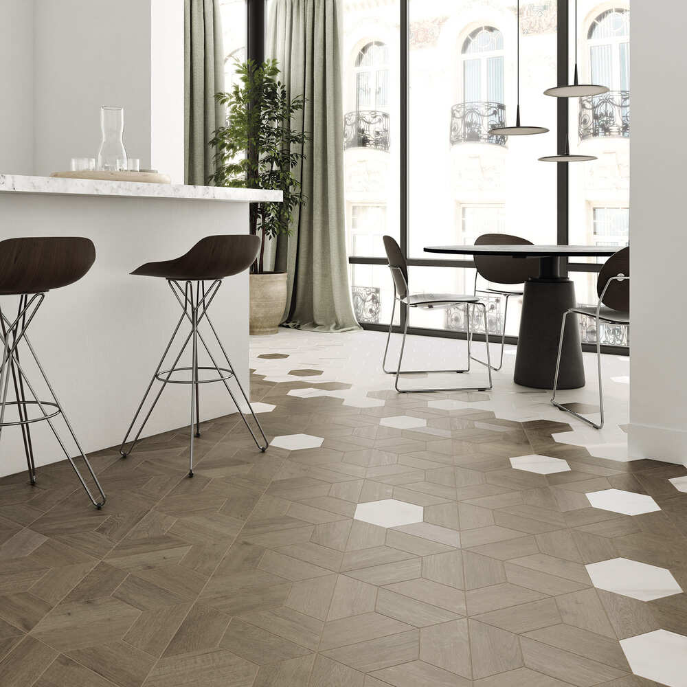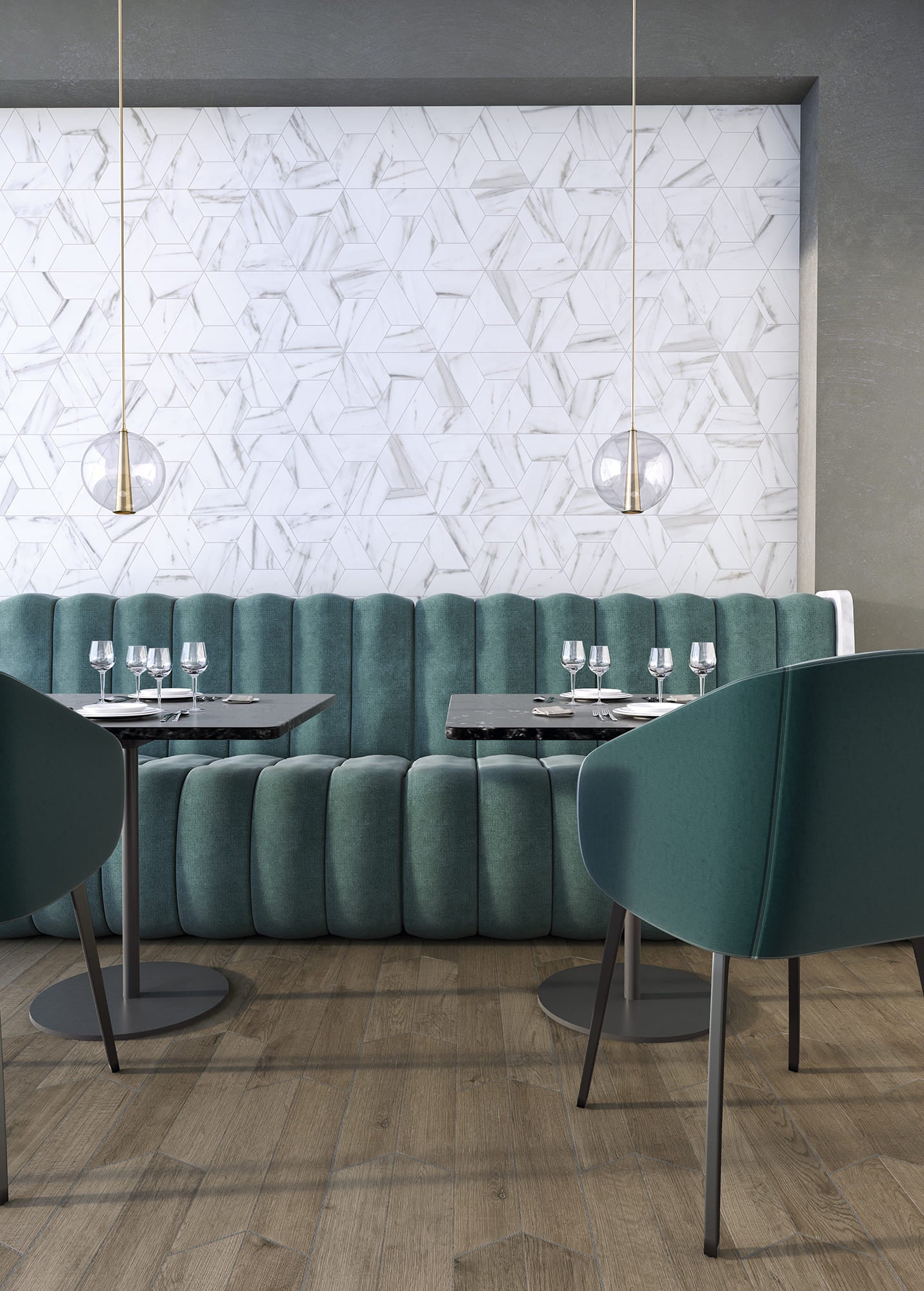 A fluid dialogue between the wood and the stone, that allows open plan stays with floors smoothly blended without room dividers. Chevron and Trapezoid are complementary shapes with a 60º angle in common to set up in combination or solo. Three natural wooden tones and a calacatta-inspired stone conforming the unusual elegance of 60 DEGREE.