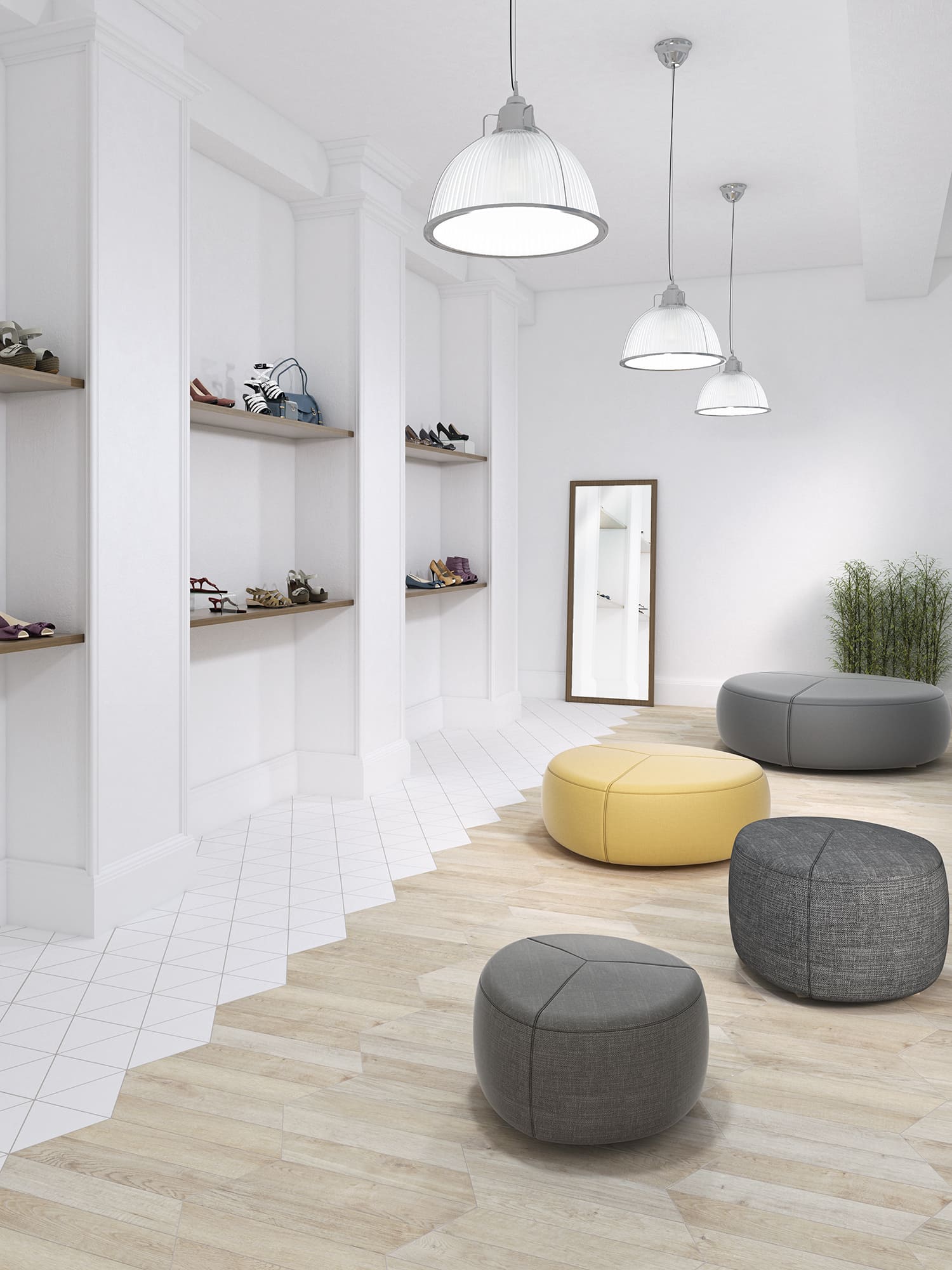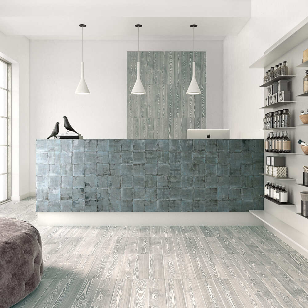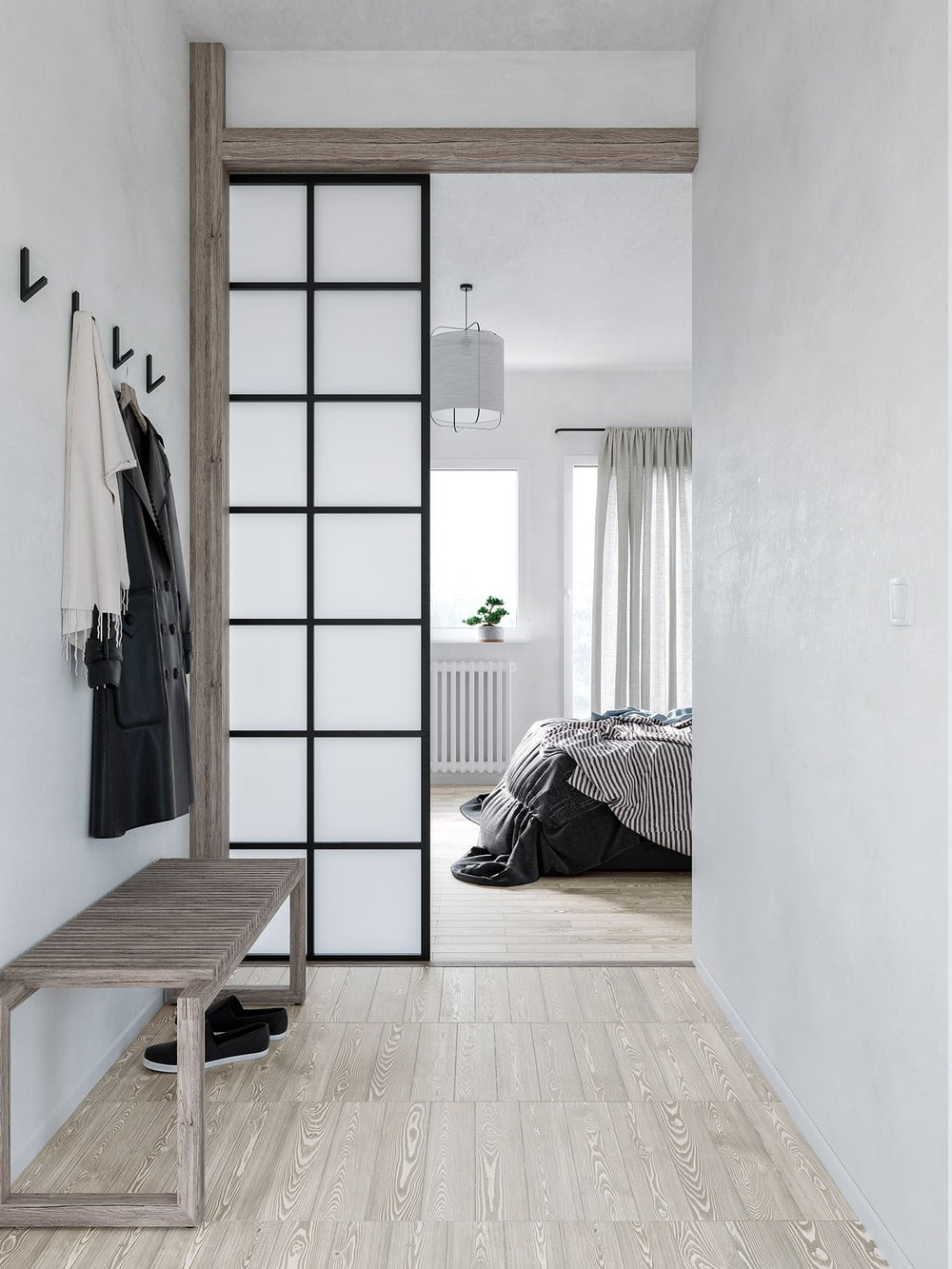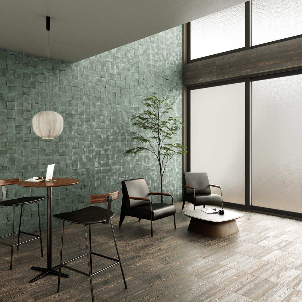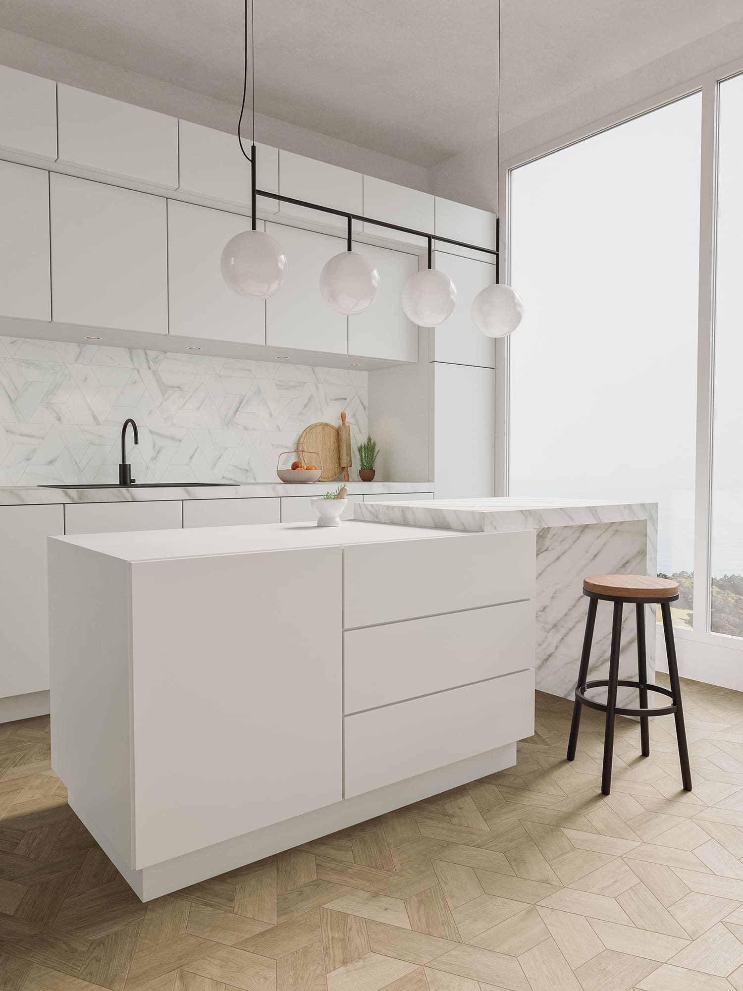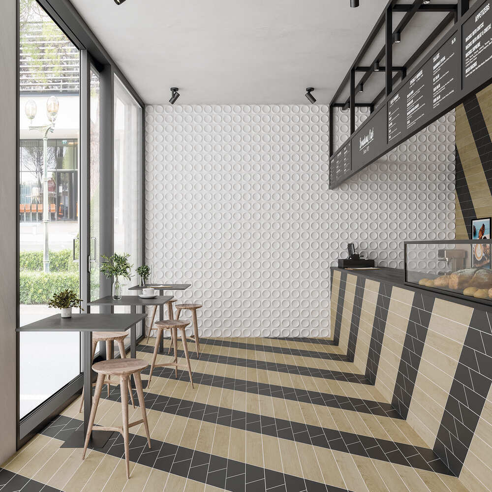 A fluid dialogue between the wood and the stone, that allows open plan stays with floors smoothly blended without room dividers. Chevron and Trapezoid are complementary shapes with a 60º angle in common to set up in combination or solo. Three natural wooden tones and a calacatta-inspired stone conforming the unusual elegance of 60 DEGREE.