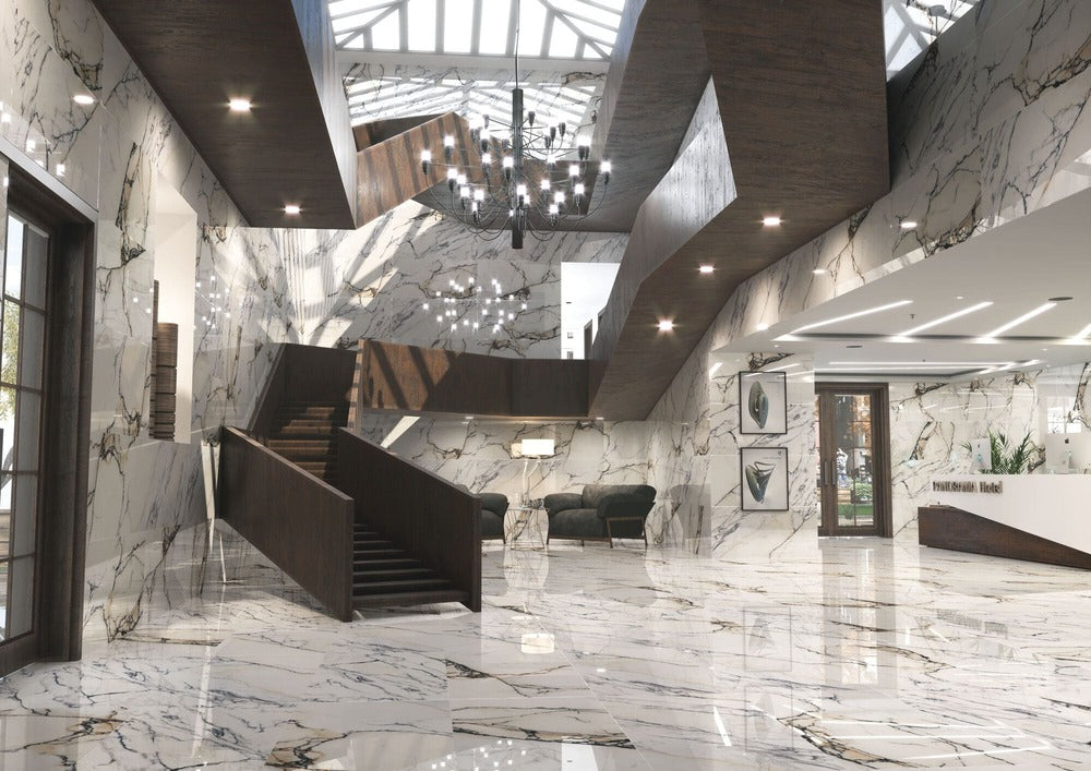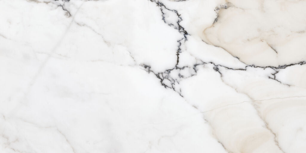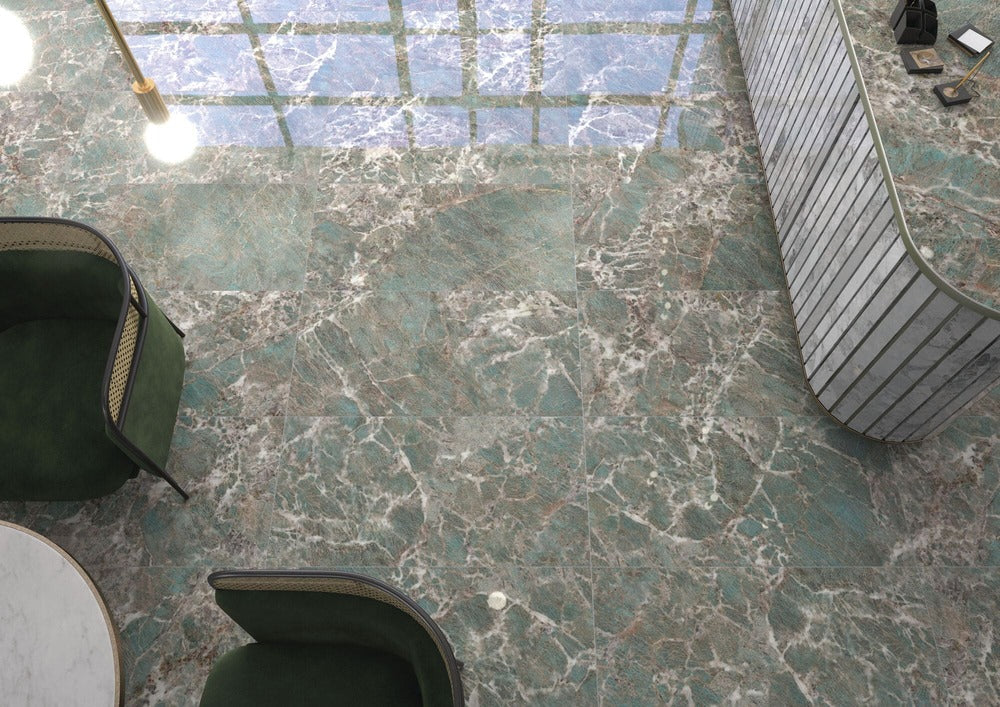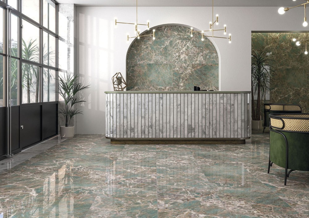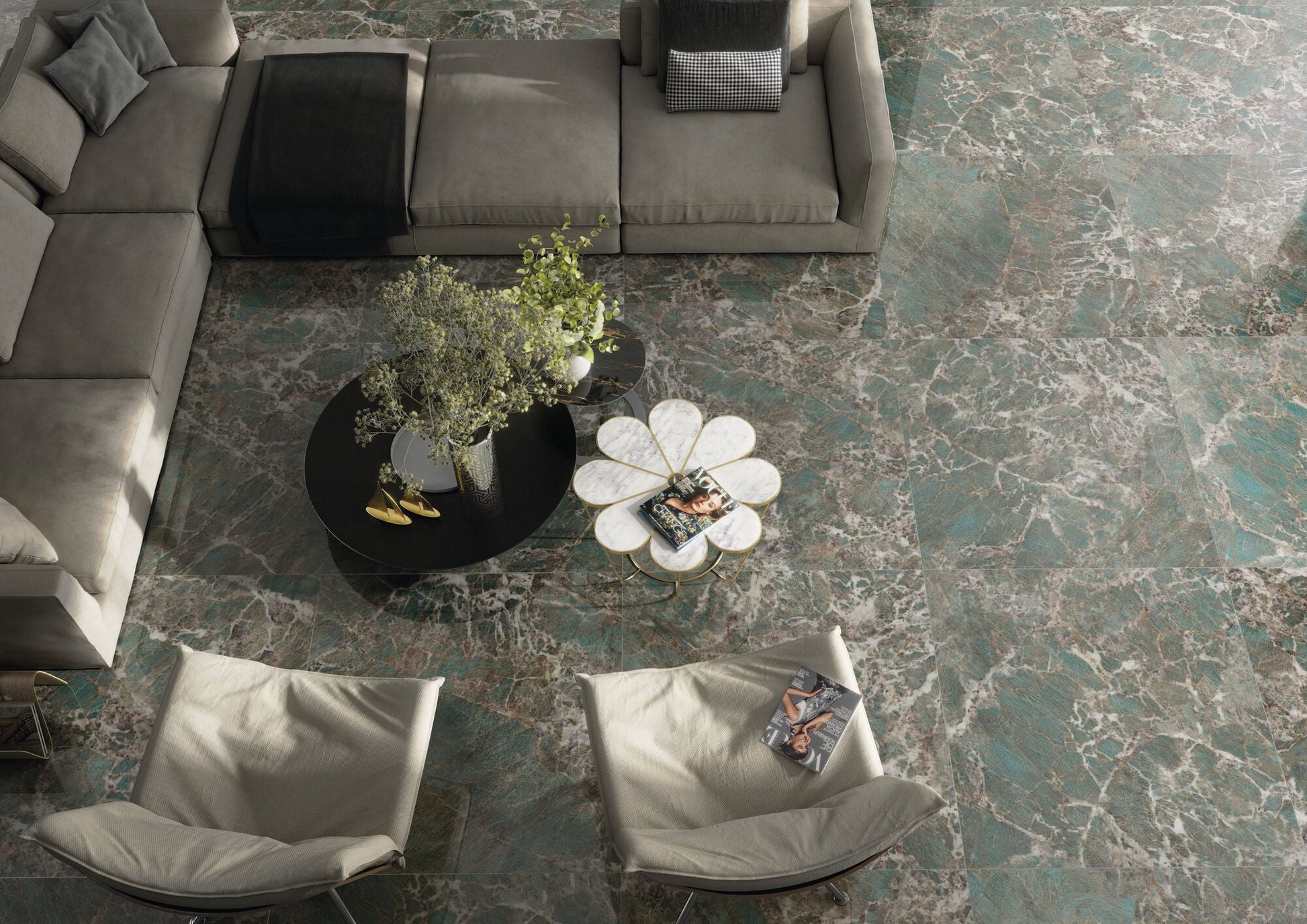 This series of natural stone effect tiles has a unique, dense, and mottled texture, which is enhanced by the polished finish. This exclusive and precious collection stands out for its elegant colors and veins, which give it an enchanting appearance. This rectified polished porcelain tile is available in two different formats for incorporation in all types of applications, whether as ceramic flooring or wall tiles.