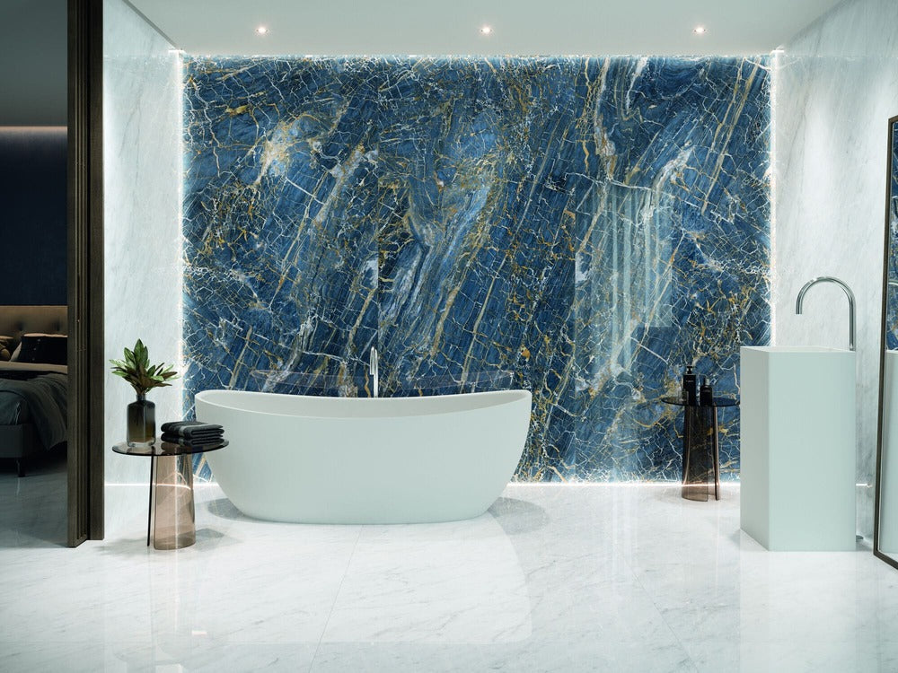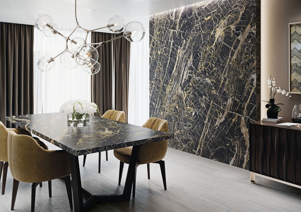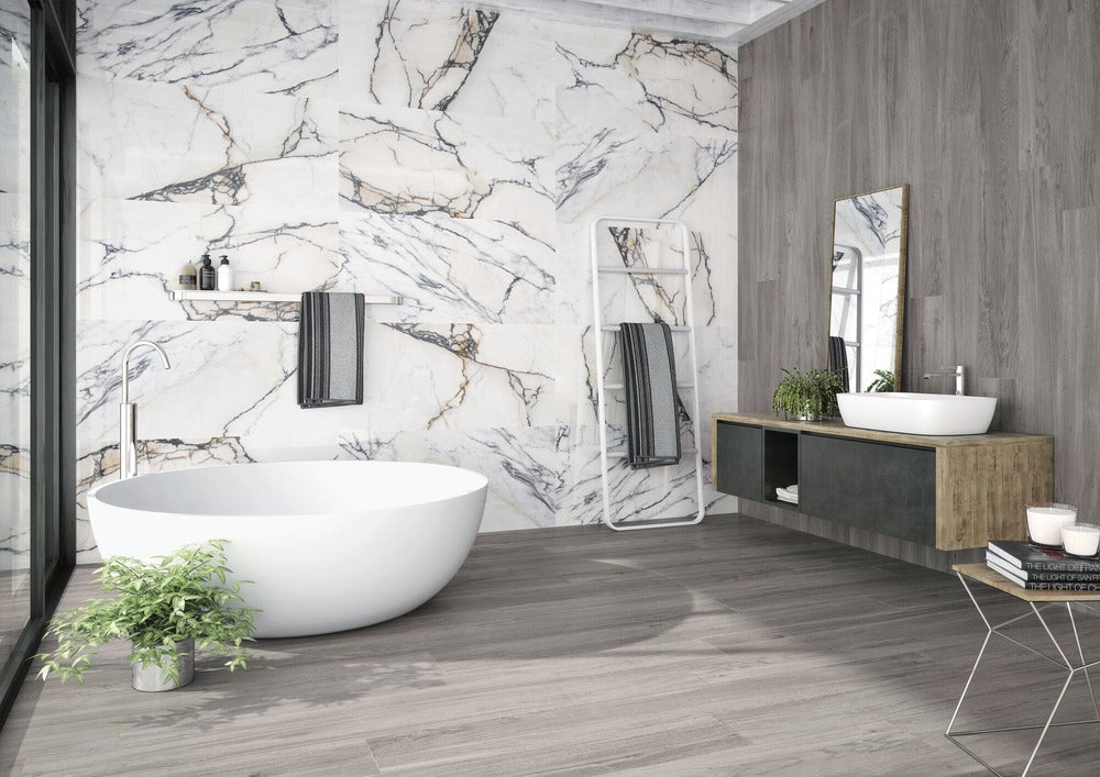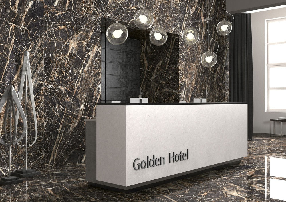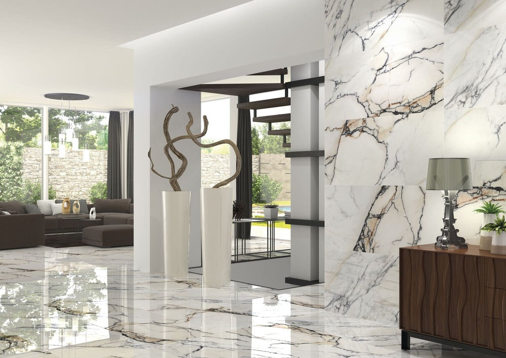 This series of natural stone effect tiles has a unique, dense, and mottled texture, which is enhanced by the polished finish. This exclusive and precious collection stands out for its elegant colors and veins, which give it an enchanting appearance. This rectified polished porcelain tile is available in two different formats for incorporation in all types of applications, whether as ceramic flooring or wall tiles.