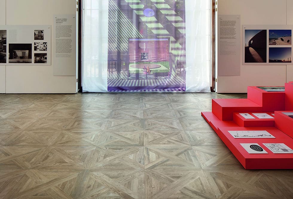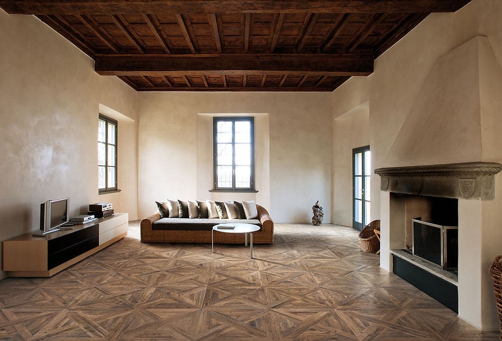 Baita was designed to pay homage to the traditional Stube, the rooms with wooden walls and floors typical of homes in the Alpine areas, inside which daily family life would take place. These traditional settings, which still play an important role today in homes and commercial premises in the mountains, are alluded to in the wood-like intertwined patterns that are the distinctive feature of this ceramic collection.